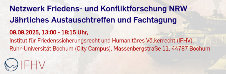 On Tuesday, 9 September 2025, the annual conference of the Peace and Conflict Research Network NRW will take place, this time at the Institute for Peace Security Law and Humanitarian International Law (IFHV) at Ruhr University Bochum, located directly at Bochum Central Station (IFHV, Massenbergstraße 11, conference room, 6th floor, 44787 Bochum).